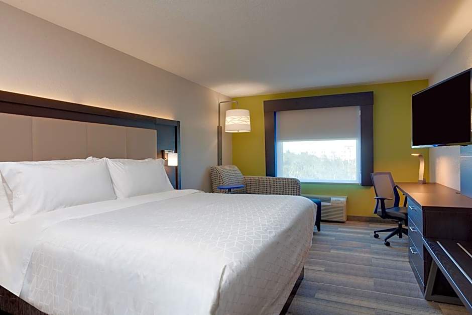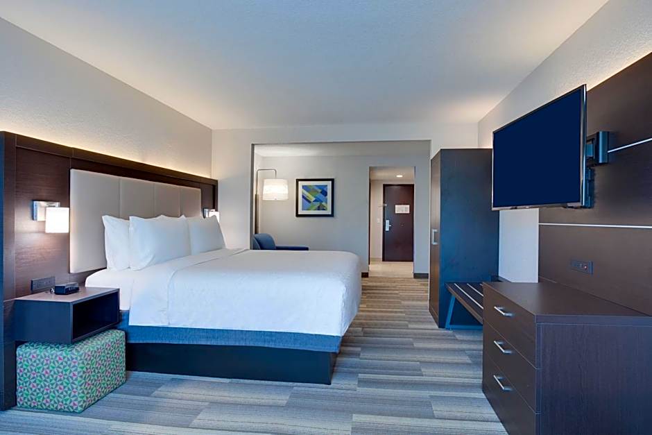This suite features a 32-inch flat-screen TV, a microwave, a small refrigerator, and a separate seating area with a sofa bed.