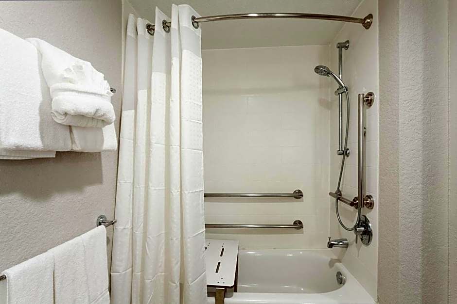 This guestroom features a microwave, a small refrigerator and a mobility accessible bath tub.